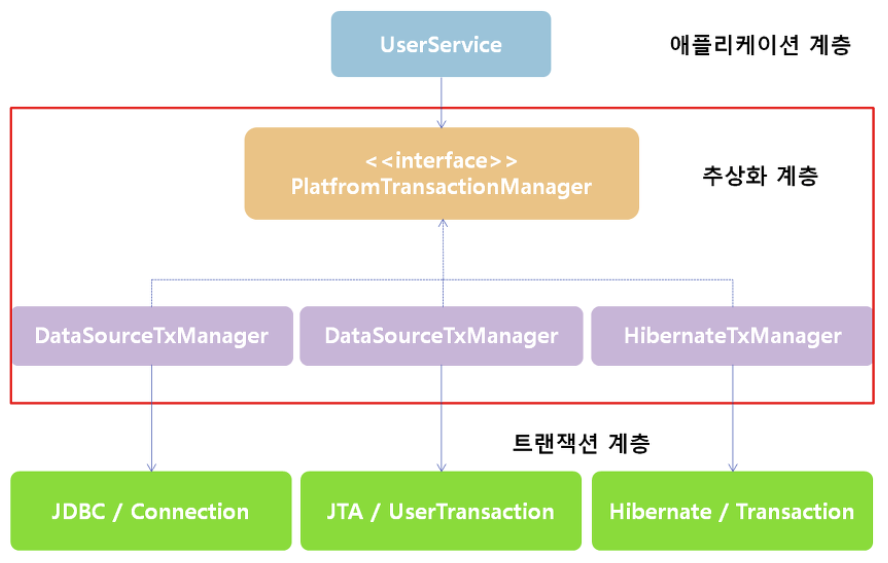 스프링 프레임워크에서는 PlatformTransactionManager 추상화를 통해 개발자가 어떤 환경 속에서도 연속적인 프로그래밍 모델이 가능하도록 설계되었다.